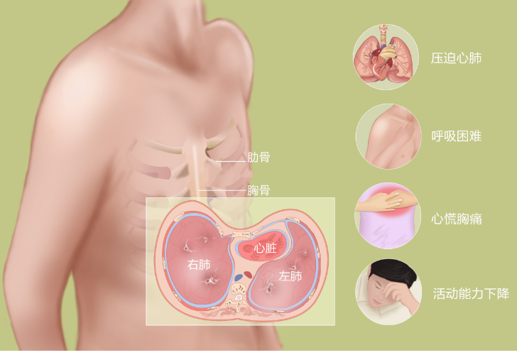 - 影响:严重时可能压迫心脏和肺部,导致心悸、呼吸困难或运动能力下降。
