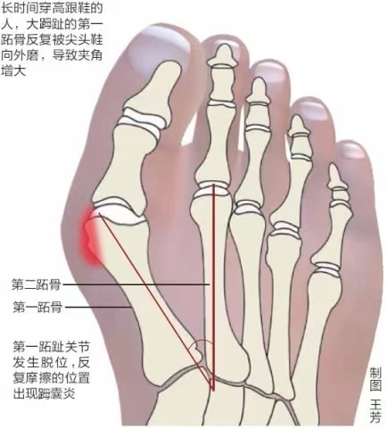 2. **穿鞋不当**:长期穿高跟鞋、尖头鞋等前掌狭窄的鞋子,挤压脚趾。